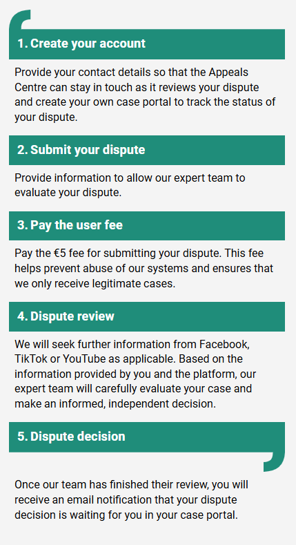 Cases can be brought by individuals or organisations from across Europe **and at no cost** for the time being. The Appeals Centre aims to regularly publish data on its work, which can be used by researchers, regulators, and other interested parties.